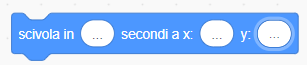 Questo blocco è simile al precedente, con la differenza che lo spostamento dello sprite dalla posizione di quel momento alla posizione indicata dal blocco non avviene istantaneamente ma è rallentato in base al numero di secondi che viene scritto nel blocco stesso.