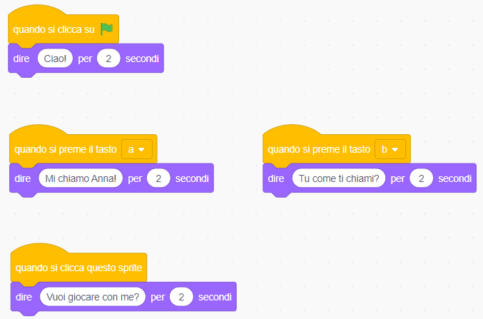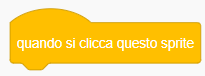 In questo caso tutte le istruzioni collocate al di sotto di questo blocco vengono eseguite solo al cliccare sullo sprite cui si riferiscono queste stesse istruzioni. Quindi possono essere eseguite sia all’inizio di un programma ma anche, forse soprattutto, durante l’esecuzione di un programma, e questa situazione rende interattivo il programma e coinvolge sicuramente di più l’utente, anche quando sono presenti più sprite e viene chiesto di interagire con essi.