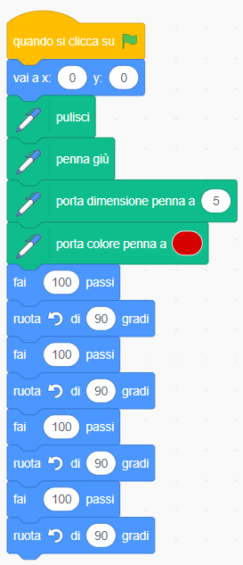 L’ultima istruzione, cioè la rotazione di 90° verso sinistra, sembrerebbe non necessaria, perché la matita disegna il quadrato anche senza questa istruzione, però va messa per riportare la penna nella condizione di partenza del programma, altrimenti all’esecuzione successiva verrebbe disegnato un quadrato in un altro quadrante. Per carità, il quadrato non è in discussione, però un buon programma deve darci sempre lo stesso risultato ad ogni esecuzione.