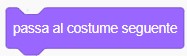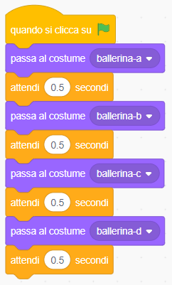 Si può osservare come lo sprite Ballerina cambia i suoi 4 costumi (a, b, c, d) e tra un cambiamento e l’altro è stata posta una pausa di 0.5 secondi. Notate che nel blocco “passa al costume …” accanto a ballerina-a c’è una freccia che vi permette di selezionare tutti gli altri costumi.