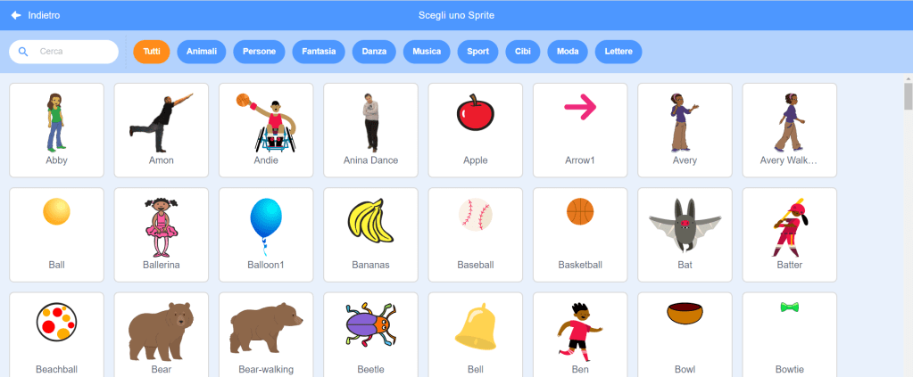 Si aprirà una nuova finestra con tanti sprite da poter scegliere. Se vi soffermate su ciascuno di essi, vedrete che si muoveranno, in base ai costumi che sono stati caricati di default nel programma.
