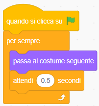 Ma l’animazione dura un ciclo solo. Come possiamo fare per farla durare di più? Non è pensabile scrivere 10, 100, 1000 volte queste istruzioni. Fortunatamente nella categoria Controllo possiamo utilizzare il blocco per sempre. Dobbiamo fare attenzione, però, che all’interno del ciclo devo utilizzare un altro blocco per gestire i passaggi di costume, perché questa deve essere automatizzata: il blocco è