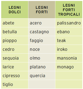 La durezza, in base alla quale i legnami si classificano in duri o forti (ad esempio: rovere, noce, olmo) e dolci o teneri (ad esempio: abete, betulla, pioppo).