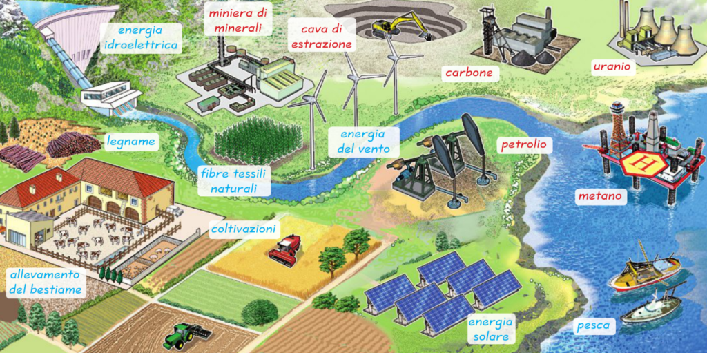 Il nostro pianeta è ricco di risorse naturali, come l’acqua e l’aria, il legno e i minerali, il carbone e il petrolio, ecc. Alcune risorse possono essere utilizzate così come sono, altre devono essere trasformate (l’acciaio non si trova in natura, ma si ricava dai minerali che contengono il ferro).